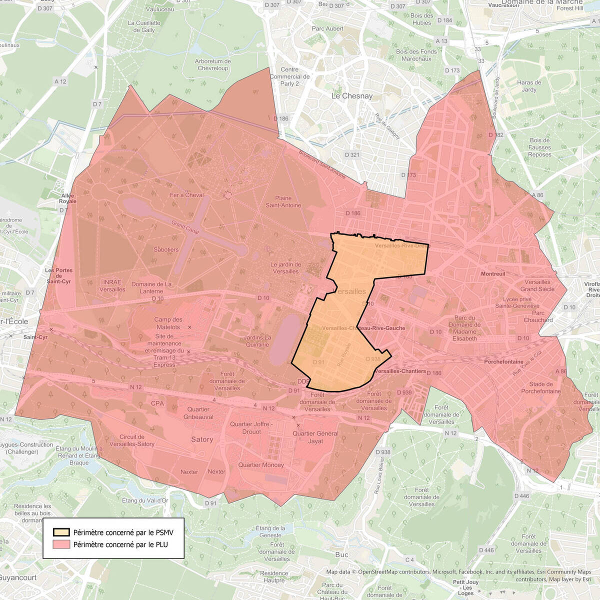 Le PLU de Versailles couvre l'ensemble du territoire de Versailles à l’exception de l'emprise du Site Patrimonial Remarquable (SPR) où le Plan de Sauvegarde et de Mise en Valeur (PSMV) se substitue au PLU.