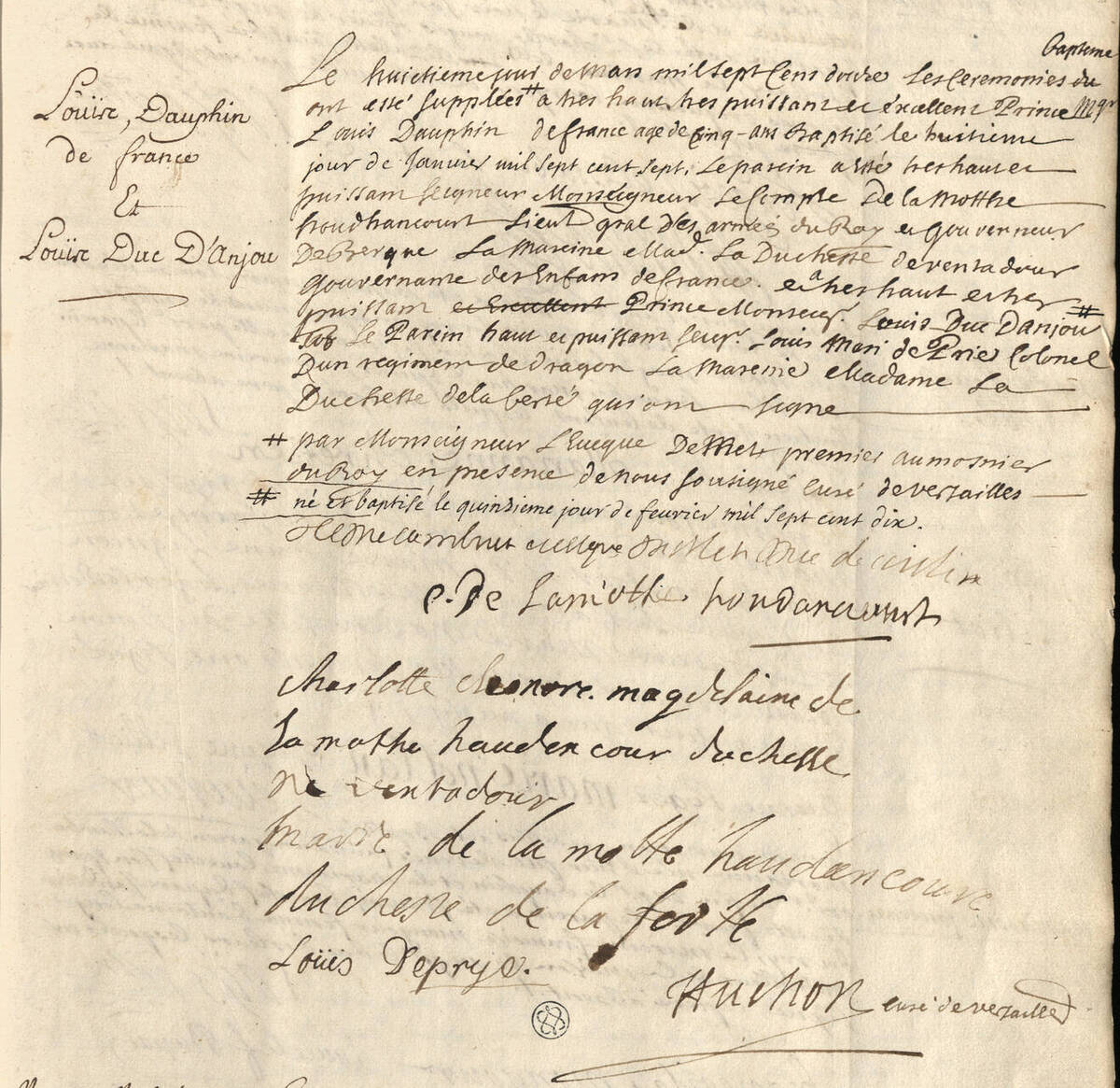 ** né et baptisé le quizieme jour de février mil sept cent dixH… Cambout eveque de Metz Duc de coislin