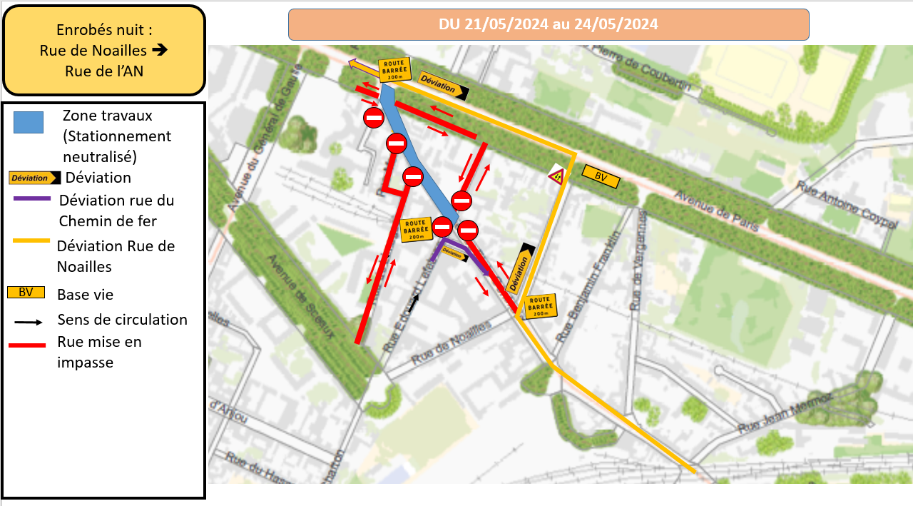 Un itinéraire de déviation sera mis en place par la rue de Noailles qui permettra la liaison entre l'avenue de Paris et la rue des Chantiers.
