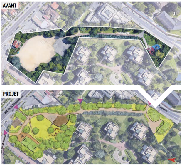 Ce parc de 10 000 m2 était composé d’un parc pour enfants, d’un couloir vert avec tables de ping-pong, d’un grand espace comprenant un terrain de foot et d’un terrain de basket. C’est cette zone qui a fait l’objet d’un réaménagement total afin de permettre un juste équilibre entre activités, publics et générations.