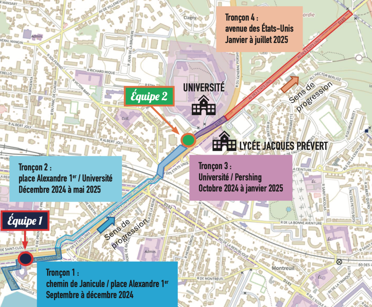 Le chantier passe également devant les établissements scolaires pendant les périodes de vacances. Les accès piétons et l’organisation des circulations sont néanmoins adaptés durant cette période. Des perturbations temporaires sont également à prévoir sur la circulation y compris celle des lignes de bus (6201• 6208 • 6210 • 6284), notamment sur l’accès au quartier de Montreuil via l’avenue des États-Unis, qui est partiellement impacté depuis le début du mois d’octobre. Entre le pont de Picardie et le monument Pershing-Lafayette, les travaux ont débuté fin octobre et devraient se terminer en juillet 2025.