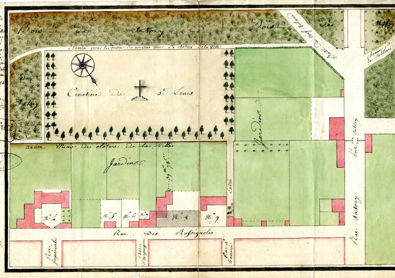 Un premier cimetière est créé en 1725, lors de la construction d'une chapelle, succursale de la paroisse-mère Notre-Dame, rendue nécessaire par le développement du quartier du Parc-aux-cerfs et bientôt érigée en paroisse indépendante sous le vocable de Saint-Louis.
