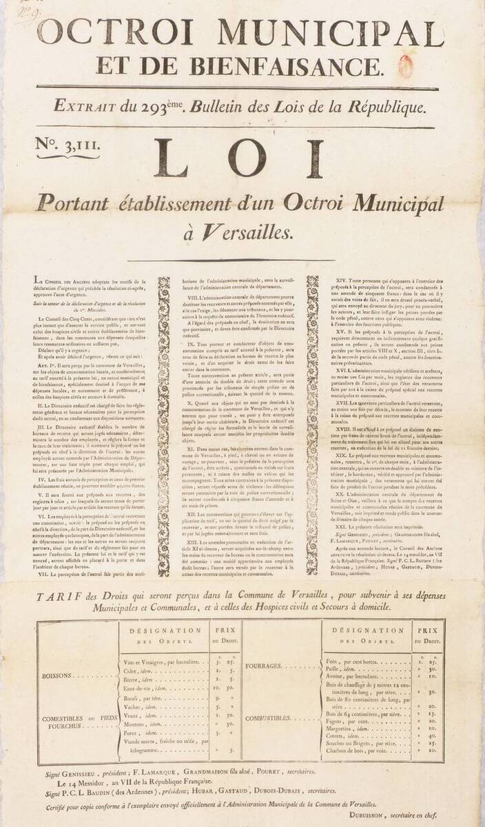 L’octroi de Versailles est perçu par le roi depuis 1745 ; celui de la municipalité est institué puis supprimé en 1790-1791, avant d’être à nouveau installé le 3 juillet 1799 avec fixation des tarifs de droits à percevoir.