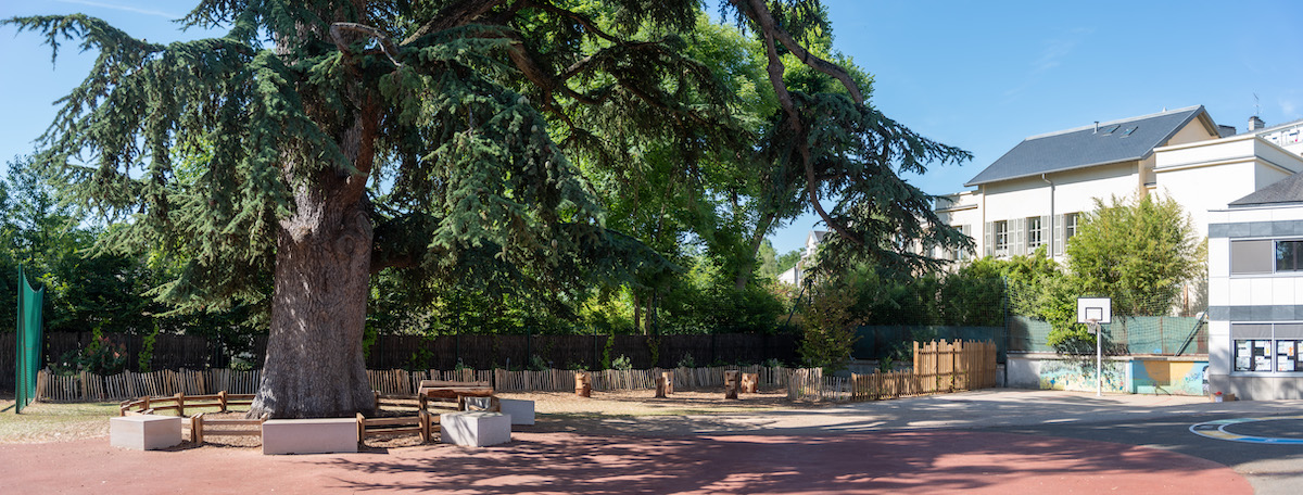 Réaménagée en 2021, la cour de récréation est mise en valeur par le cèdre vieux de plus de 200 ans, l’installation d’assises naturelles (pierre et bois), de pavés enherbés, d’enrobé clair, de mulch et de nouvelles plantations.