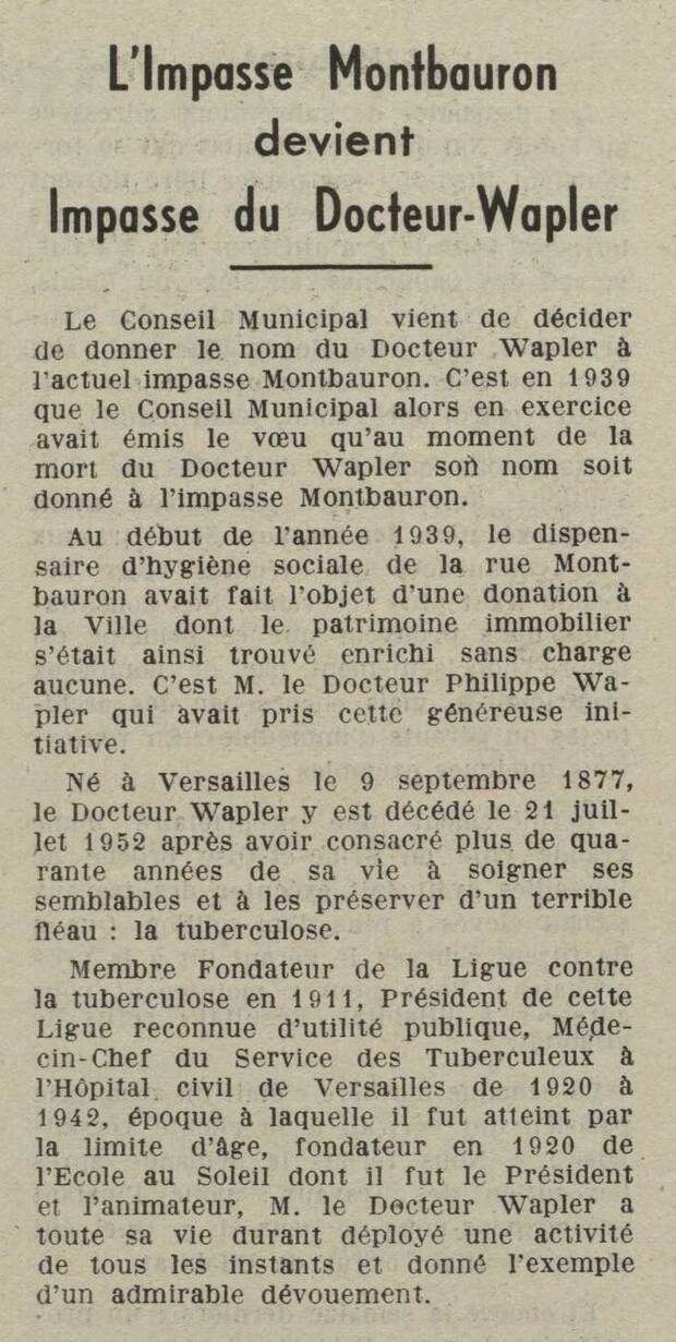 Le 8 octobre 1954, le conseil municipal décide de renommer l’impasse Montbauron selon le souhait exprimé par le docteur Wapler en 1939. Ce lieu est également significatif, car il doit alors accueillir prochainement un important centre de protection maternelle et infantile.