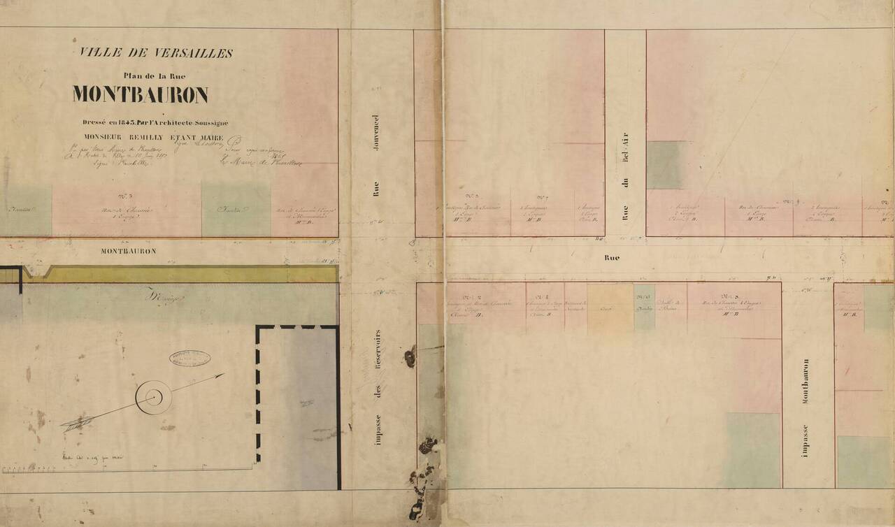Plan d’alignement de l’impasse Montbauron (actuelle impasse du Docteur-Wapler), [extrait]. Plan couleur, Le Poitevin, 1843. Coll. ACV, 2Fi178.