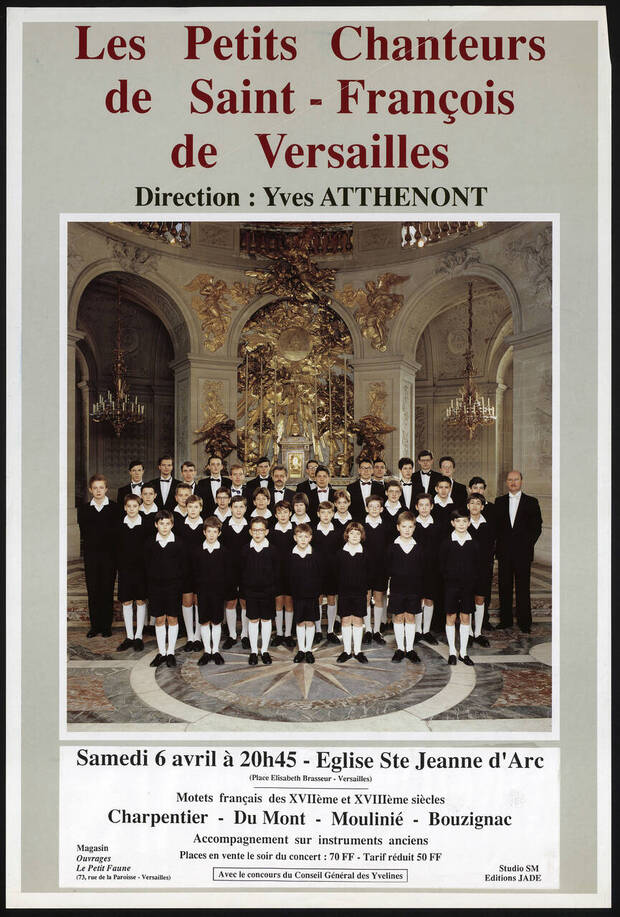 Légende de l'image : Les Petits chanteurs de Saint-François de Versailles. Direction : Yves Atthenot. Samedi 6 avril à 20h45, église Sainte-Jeanne d'Arc (place Élisabeth-Brasseur, Versailles). Affiche, Studio SM, édition Jade, s. d. Coll. ACV, 8 Fi 164.