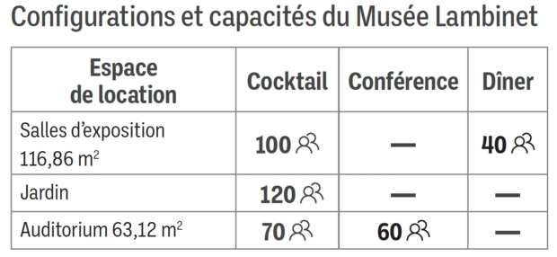 Des espaces variés pouvant accueillir de petit groupe d’une capacité maximal de 100 personnes ; salles en enfilades pour des cocktails ou un diner, auditorium de 60 places pour une réunion ou une conférence ou encore le jardin du musée aux beaux jour.