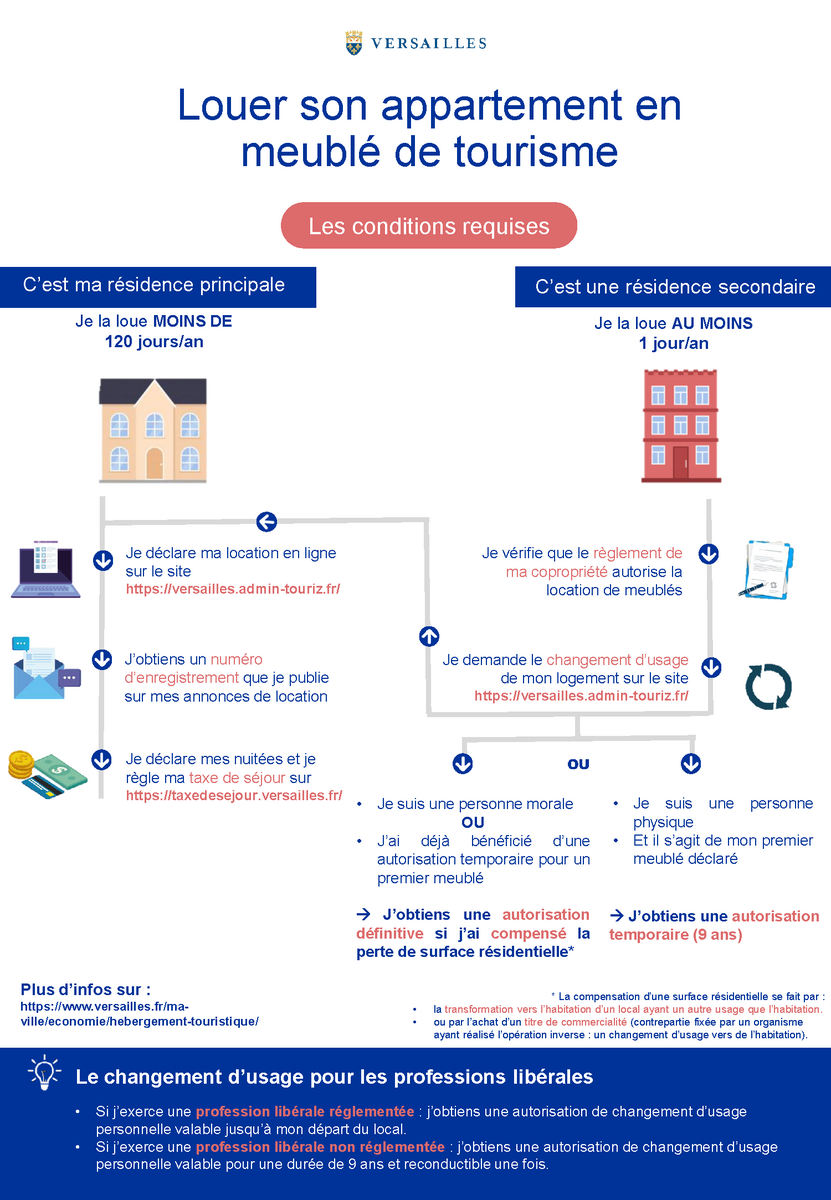 Depuis le 30 juin 2018, la délivrance d'un numéro d'enregistrement pour une déclaration de meublé de tourisme est obligatoire sur la commune de Versailles.
