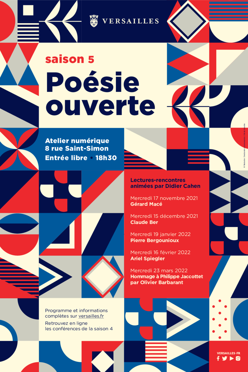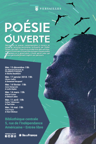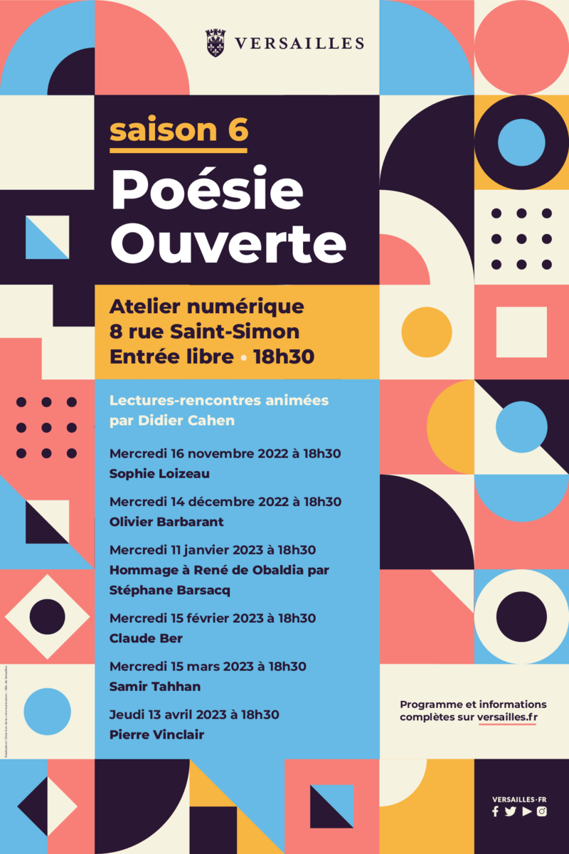 En revanche, le mercredi 12 mars, Didier Cahen animera "Une soirée poétique à Versailles". Avec des poètes qui habitent physiquement et poétiquement la ville : - Sophie Loizeau, qui vient de publier Poèmes paniques, anthologie 2001-2020 (LansKine,2024) et L’Ile du renard polaire de To Kirsikka (Champvallon, 2024)- Patrice Lobut, peintre et poète, membre de l’Académie des Sciences Morales, des Lettres et des Arts de Versailles et d'Île-de-France - Jean-Marie Guinebert, poète et Directeur des Affaires Culturelles de la Ville, en compagnie de l’éditrice Claire Garnier, directrice des éditions Illador, créées à Versailles. Ils présenteront leur poésie et en liront des morceaux choisis. Ils témoigneront ainsi de la vitalité artistique de la ville et de son engagement en faveur de la culture et de la poésie.