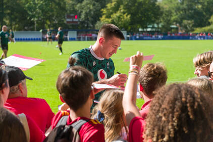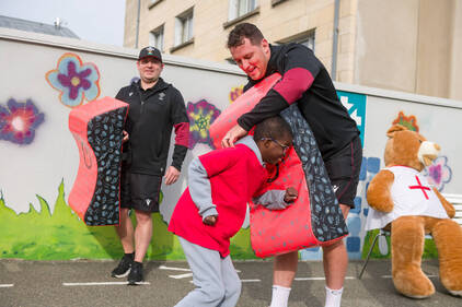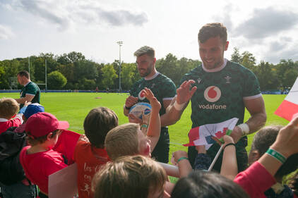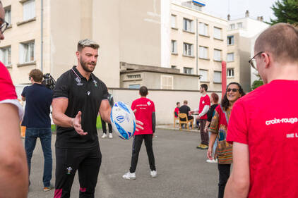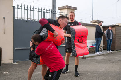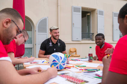 Accompagnés de leurs éducateurs, les enfants ont eu l'occasion d'échanger quelques balles, de s'initier au plaquage et de partager un moment avec les joueurs autour d'un atelier coloriage sur le thème du Pays de Galles et de la Coupe du Monde de Rugby.